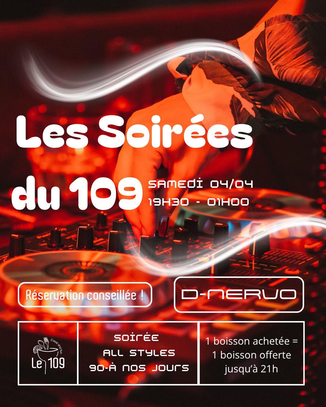 Soirée musicale avec DJ D-NERVO aux platines, proposant une ambiance All Styles allant des années 90 à aujourd’hui.